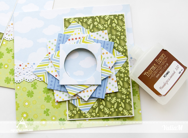 Готовий калейдоскоп-сонечко приклеюю до частини сторінки, яка вікриватиметься. Всередину калейдоскопу пізніше вставлю фото, а між елементами додам дрібні зірочки і квіточки, щоб підкреслити об'єм.